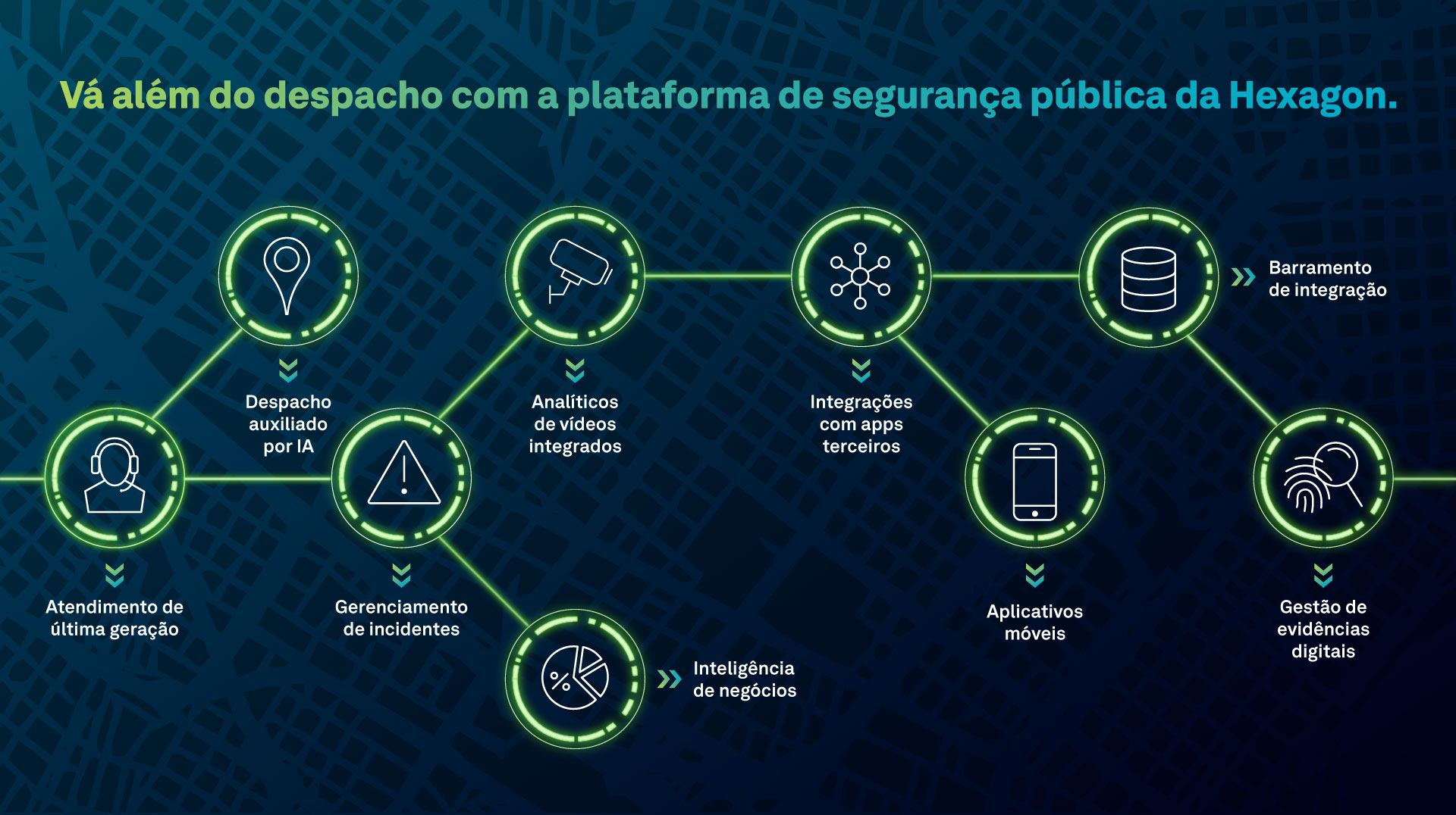 Modernize as suas operações com o mais completo portfólio de sistemas multiagência para órgãos de segurança pública. Automatize tarefas, simplifique fluxos de trabalho, integre dados, sistemas e organizações, aprimore a inteligência e a mobilidade, e responda mais rapidamente a incidentes.